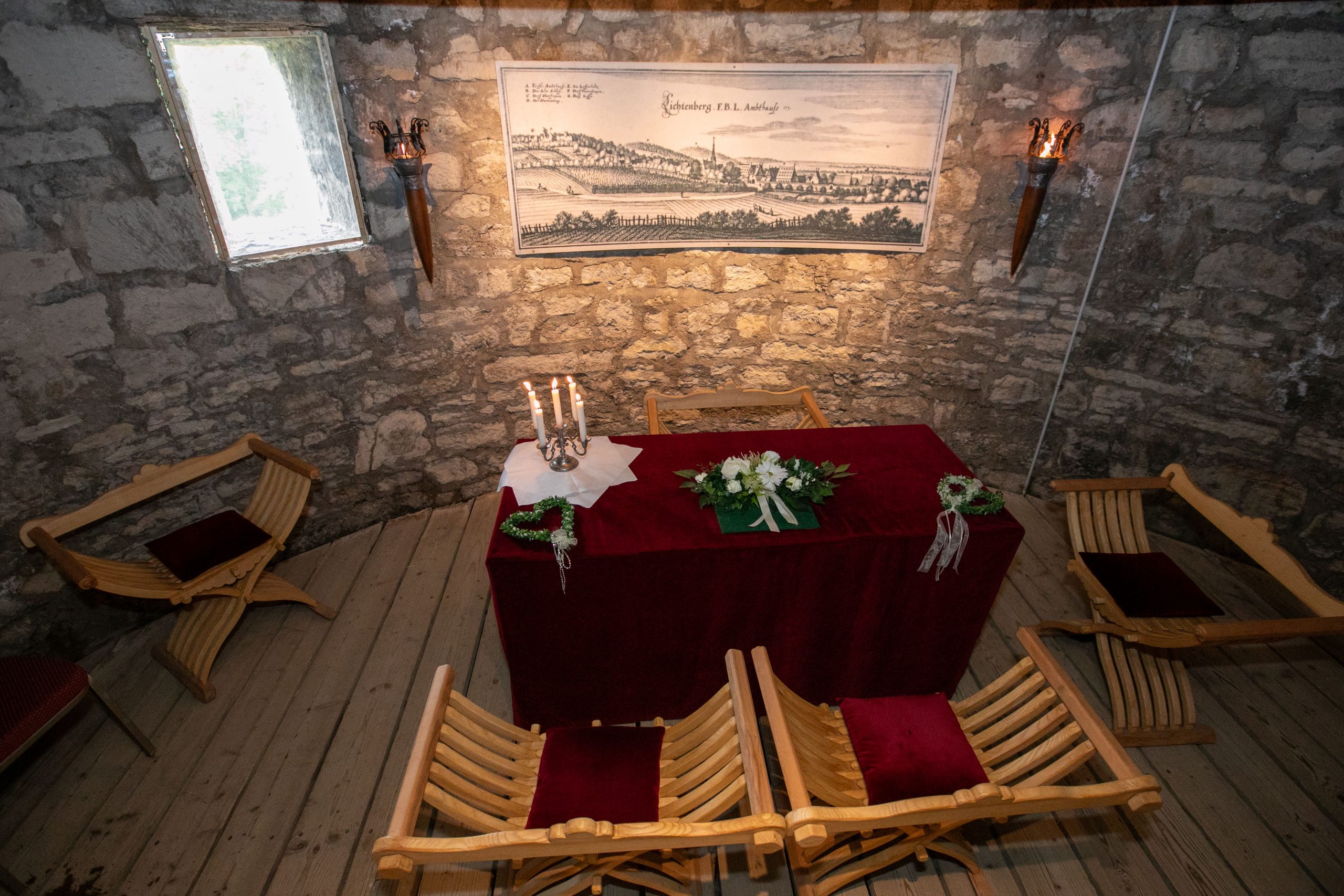 Die Burg Lichtenberg bietet Ihnen ein einzigartiges Ambiente für den schönsten Moment im Leben. In unserem liebevoll gestalteten Trauzimmer im historischen Bergfried erleben Sie Ihre Trauung in mittelalterlicher Atmosphäre – ein Ort, der Geschichte atmet und Emotionen weckt.